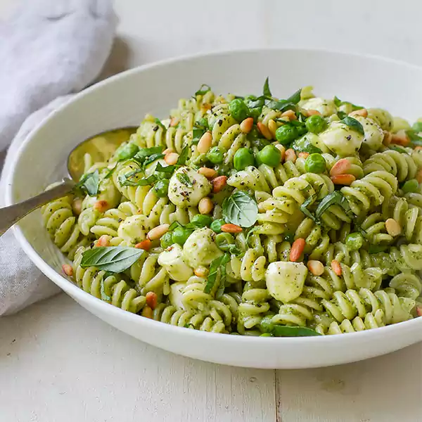 Pasta Tossed With Pesto Sauce And Sweet Corn, Cherry Tomatoes, Black Olives & Shaved Parmesan
