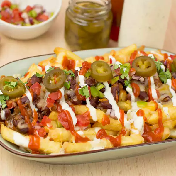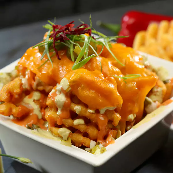Cubes Potatoes Topped With Crispy Fried Beef Bacon & Jalapeno With Cheddar Cheese, Frizzled Onion & Spinners Signature Sauce