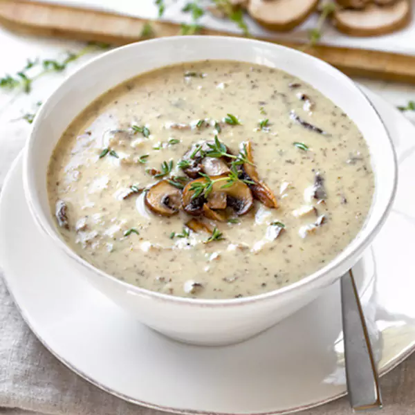 Special Creamy Mushroom Soup Served With Garlic Croutons And Lemon