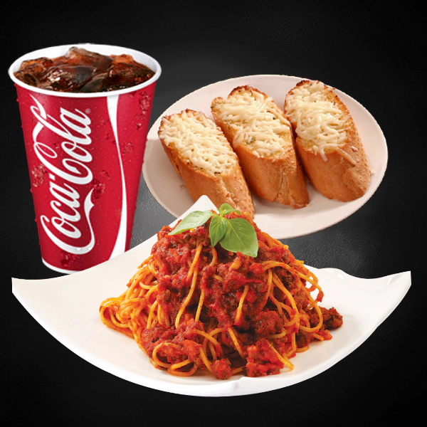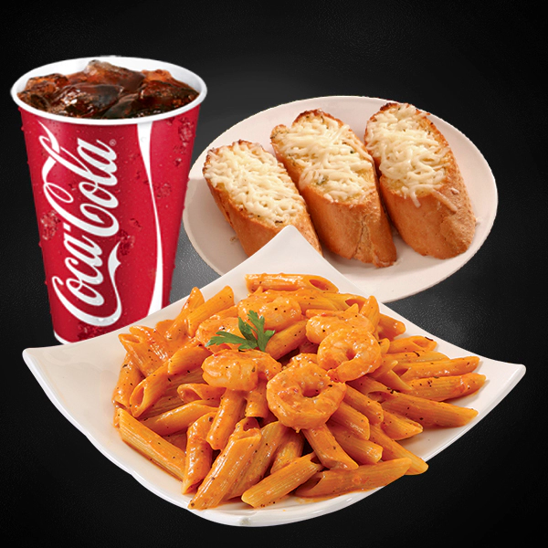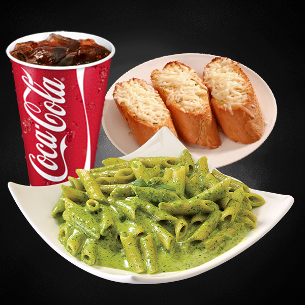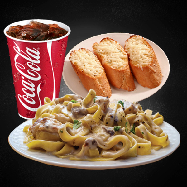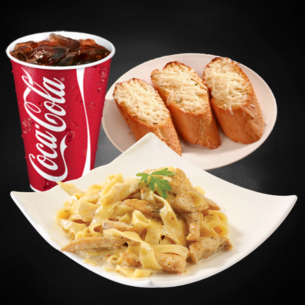 Roasted chicken, italian arborio rice, creamy pesto sauce and sundried tomatoes. Served with 2 pieces of cheesy garlic bread and medium size soft drinks.