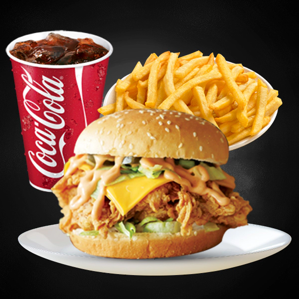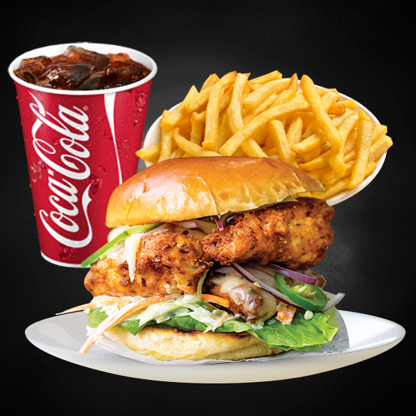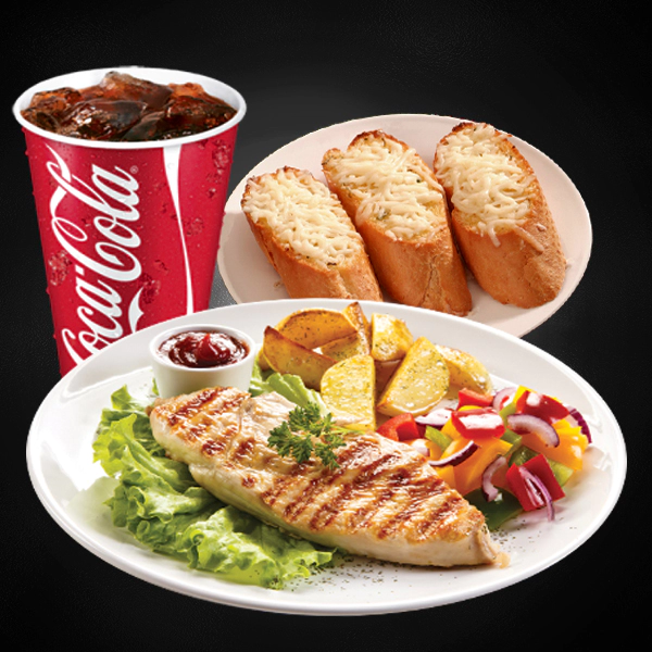 Grilled chicken with cajun, vegetables, mashed potatoes and zesty orange coulis. Served with 2 pieces of cheesy garlic bread and medium size soft drinks.