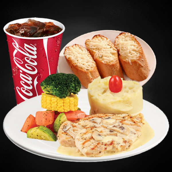 Spicy roasted chicken with parmesan, pesto rosso mushroom sauce, mashed potatoes and grilled vegetables. Served with 2 pieces of cheesy garlic bread and medium size soft drinks.